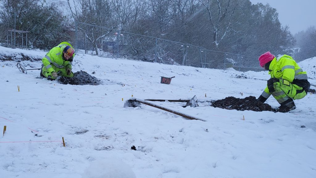 Den nionde december var det dags att packa ihop och lämna Toarp för att fortsätta arbetet inomhus. Med oss in har vi en mängd fynd, prover, dokumentation, fotografier och ritningar som nu ska analyseras och bearbetas. Redan nu kan vi konstatera att den lilla grävningsytan på flera sätt överträffat förväntningarna, även om vädret tidvis varit något av en utmaning. Som i slutet av november när snön kom.